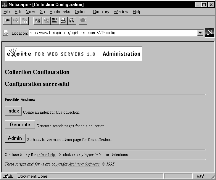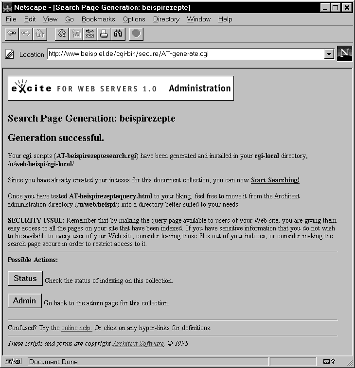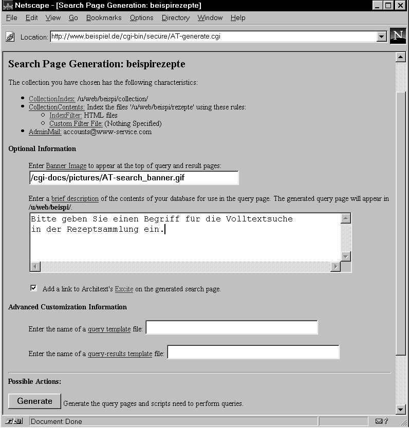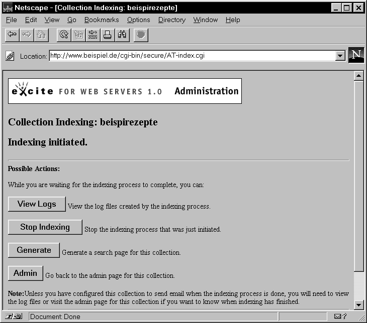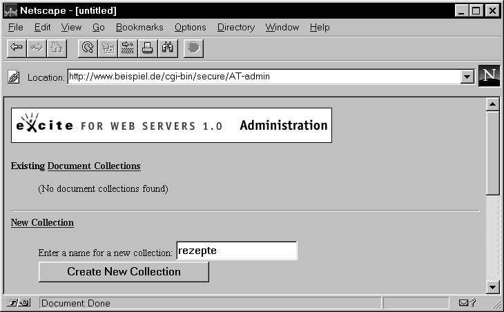 Die Excite Search Engine der Firma Architext ist eine der großen internetweit operierenden Suchmaschinen. Ähnlich wie DECs Altavista bedient sich Excite eines "Spiders", das ist ein Programm, welches automatisch Informationen im World Wide Web sammelt. Die Suchmaschine indiziert diese Informationen, und über Excite kann man dann nach Informationen im Volltext suchen. Von der Excite Suchmaschine gibt es eine spezielle Version, "Excite for Web Servers" (EWS), die auf allen virtuellen Servern VERIO Deutschlands bereits vorinstalliert sind. Mit EWS können Sie völlig problemlos eine professionelle Volltextsuche über sämtliche Informationen auf Ihrem Server oder auch nur einem Teil davon, anbieten. Excite führt dabei nicht nur eine einfachen Suche nach Schlüsselwörtern durch, vielmehr ist eine komplexe Suchstrategie implementiert, die "concept-based" genannt wird. Dabei werden diverse Methoden eingesetzt, die Suche zu verbessern. Ziel ist es, relevante Dokumente auch zu finden, wenn das gesuchte Schlüsselwort gar nicht darin vorkommt. Dabei wird unter anderem mit Wörterbüchern gearbeitet, die auf Basis von statistischen Methoden automatisch erstellt werden. Da der Großteil der Texte im Internet nach wie vor in englischer Sprache abgefaßt sind, dürfte diese Technik allerdings vor allem bei englischsprachigen Texten befriedigend funktionieren. Aber auch so ist Excite ein leistungsfähiges Werkzeug, mit welchem Sie Ihre Site um eine sehr nützliche Funktion erweitern können. Damit befinden Sie sich in bester Gesellschaft auch die Web-Sites von Forbes, JavaSoft, Chevron, Sega und United Airlines setzen auf Excite-Search. Und das beste dabei ist, daß die Implementation aufgrund der gut vorbereiteten Administrator-Funktionen sehr einfach ist. Alle notwendigen CGI-Scripts und HTML-Seiten werden anhand Ihrer Angaben automatisch generiert. Im folgenden werden wir Schritt für Schritt einen Volltextindex erstellen. Als Beispiel dient eine kleine Sammlung mit knapp hundert vegetarischen Rezepten, die wir im Verzeichnis "rezepte" auf der Domain beispiel.de gespeichert haben. Die Administrationsseite für Excite for Web Servers erreichen Sie auf Ihrer Domain unter der Adresse: http://www.IhrName.com/cgi-bin/secure/AT-admin Dabei ersetzen Sie "www.IhrName.com" durch Ihre eigene Domain. Für unsere Beispieldomain lautet die URL demnach: http://www.beispiel.de/cgi-bin/secure/AT-admin Sie können die Dateien oder Verzeichnisse spezifizieren, die in die Suche einbezogen werden sollen, indem Sie sogenannte "document collections" anlegen. Es ist auch möglich, auf einer Domain mehrere collections anzulegen und für jede der collections eine unabhängige Volltextsuche zu implementieren.