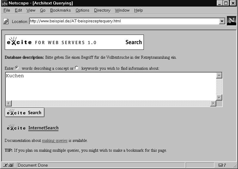 Daraufhin wird eine Standard-HTML-Seite generiert und in Ihrem Root-Verzeichnis gespeichert. Sie können die Seite später in ein Verzeichnis Ihrer Wahl kopieren. Dies ist die Seite, von welcher Ihre Besucher die Volltextsuche ausführen können. Auch die Seite mit den Suchergebnissen wird automatisch vorbereitet. Bestätigungsmeldung für das Generieren der Such- und der Ergebnisseite Die nächste Seite gibt Aufschluß darüber, wie die Such-Seite heißt und wo sie zu finden ist. Auf der Seite mit der Bestätigungsmeldung finden Sie einen Link zur Suchseite, damit können Sie das neue Feature sofort ausprobieren. Die Standard-Suchseite von Excite Die Seite mit den Suchergebnissen Nachträgliche Änderungen und Aktualisierungen Eine einmal erstellte "document collection" wird oben in der Administrator-Seite (www.IhrName.com/cgi-bin/secure/AT-admin) aufgeführt. Der Doppelklick auf einen Eintrag lädt eine Seite, in welcher sämtliche Optionen zur Aktualisierung bestehender collections zur Auswahl stehen. Administration bestehender "document collections" Wenn Sie Änderungen in dem indizierten Bereich Ihrer Datei durchgeführt haben, geht das zunächst einmal spurlos an dem Index vorbei. Das heißt, die aktuellen Änderungen werden bei der Suche nicht berücksichtigt. In diesem Fall muß der Index auf dem Wege der kompletten Neuindizierung aktualisiert werden (Schalter: Index). Zuvor können Sie wenn nötig die Konfiguration für den Indizierungsvorgang ändern (Configuration). Außerdem kann man einen kompletten Index, zusammen mit den Hilfsdateien komplett löschen (Remove). Anpassen der Such- und der Ergebnisseite Nun werden Sie sicher den Wunsch haben, die Such- und Ergebnisseite an das Layout der restlichen Seiten Ihrer Site anzupassen. Auch daran haben die Macher von Excite for Web Servers gedacht. Für die Suchseite gibt es zwei Möglichkeiten. Zum einen können Sie die generierte Seite nachträglich anpassen, umbenennen und in das richtige Verzeichnis kopieren. Für die zweite Methode bereiten Sie eine HTML-Seite vor, die dem Generator als "Schablone" (template) dient. Es handelt sich dabei um eine normale HTML-Datei, die Sie nach eigenen Wünschen frei gestalten können. Wichtig ist lediglich, daß die Zeile ###ARCHITEXT### enthalten sein muß. An diese Stelle wird das Abfrageformular von Excite eingefügt. Hier ein ganz einfaches Beispiel für eine solche Schablone: