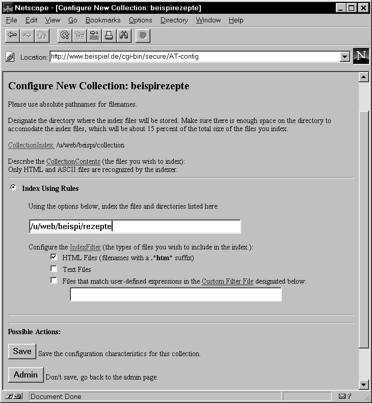 In unserem Beispiel heißt das Root-Verzeichnis des virtuellen Servers von www.beispiel.de: /u/web/beispi/ Statt "beispi" müssen Sie hier den Usernamen für Ihre Domain angeben. Da für unser Beispiel nur die Rezepttexte, die sich im Verzeichnis "rezepte" befinden. durchsucht werden sollen, tragen wir hier ein: /u/web/beispi/rezepte Die unter dem angegebenen Verzeichnis liegenden Subdirectories werden ebenfalls in die Suche mit einbezogen. In den folgenden Auswahlboxen kreuzen Sie an, ob HTML-Seiten und/oder reine Textseiten durchsucht werden sollen. Wenn die Option HTML-Files ausgewählt ist, werden alle Dateien mit der Endung .HTM* als HTML-Dateien interpretiert und ausgewertet. Das heißt, die Tags und Attribute werden nicht mit indiziert. Außerdem können Sie eine IndexFilter-Datei aktivieren. In einer solchen Datei können Sie noch genauere Vorgaben für die Einbeziehung oder den Ausschluß bestimmter Dateien oder Verzeichnisse machen. In den meisten Fällen wird dies nicht nötig sein, daher verweisen wir hier auf die Original-Dokumentation, die über die Administrator-Seite zugänglich ist. Nach dem Eintrag dieser Informationen drückt man den "Save"-Schalter um die Konfiguration zu sichern. Bestätigung der erfolgreichen Konfiguration Auf dem darauf folgenden Bildschirm wird die erfolgreiche Konfiguration bestätigt. Als nächstes kann man den Index berechnen lassen oder die Suchseite generieren.