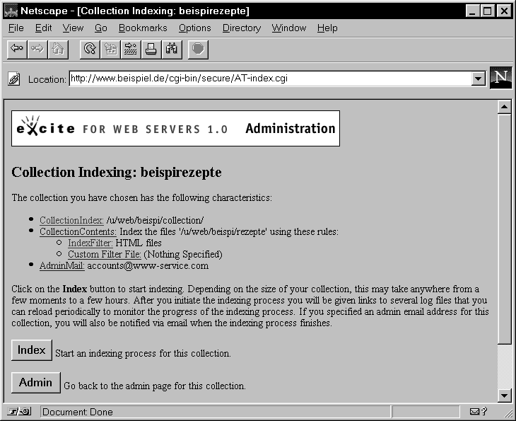Der Druck auf den "Index"-Schalter lädt eine Seite mit weiteren Informationen. Um den eigentlichen Prozeß der Indizierung zu starten. müssen Sie hier noch einmal den "Index"-Schalter drücken. 3. Schritt: Index generieren.