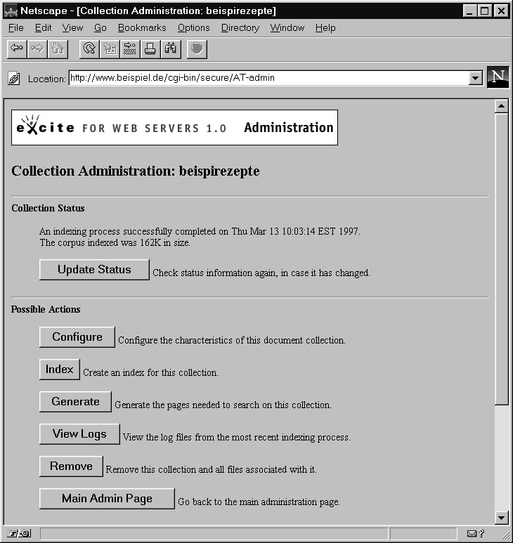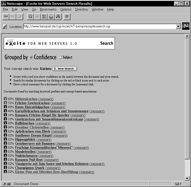 Die Excite Search Engine der Firma Architext ist eine der großen internetweit operierenden Suchmaschinen. Ähnlich wie DECs Altavista bedient sich Excite eines "Spiders", das ist ein Programm, welches automatisch Informationen im World Wide Web sammelt. Die Suchmaschine indiziert diese Informationen, und über Excite kann man dann nach Informationen im Volltext suchen. Von der Excite Suchmaschine gibt es eine spezielle Version, "Excite for Web Servers" (EWS), die auf allen virtuellen Servern VERIO Deutschlands bereits vorinstalliert sind. Mit EWS können Sie völlig problemlos eine professionelle Volltextsuche über sämtliche Informationen auf Ihrem Server oder auch nur einem Teil davon, anbieten. Excite führt dabei nicht nur eine einfachen Suche nach Schlüsselwörtern durch, vielmehr ist eine komplexe Suchstrategie implementiert, die "concept-based" genannt wird. Dabei werden diverse Methoden eingesetzt, die Suche zu verbessern. Ziel ist es, relevante Dokumente auch zu finden, wenn das gesuchte Schlüsselwort gar nicht darin vorkommt. Dabei wird unter anderem mit Wörterbüchern gearbeitet, die auf Basis von statistischen Methoden automatisch erstellt werden. Da der Großteil der Texte im Internet nach wie vor in englischer Sprache abgefaßt sind, dürfte diese Technik allerdings vor allem bei englischsprachigen Texten befriedigend funktionieren. Aber auch so ist Excite ein leistungsfähiges Werkzeug, mit welchem Sie Ihre Site um eine sehr nützliche Funktion erweitern können. Damit befinden Sie sich in bester Gesellschaft auch die Web-Sites von Forbes, JavaSoft, Chevron, Sega und United Airlines setzen auf Excite-Search. Und das beste dabei ist, daß die Implementation aufgrund der gut vorbereiteten Administrator-Funktionen sehr einfach ist. Alle notwendigen CGI-Scripts und HTML-Seiten werden anhand Ihrer Angaben automatisch generiert. Im folgenden werden wir Schritt für Schritt einen Volltextindex erstellen. Als Beispiel dient eine kleine Sammlung mit knapp hundert vegetarischen Rezepten, die wir im Verzeichnis "rezepte" auf der Domain beispiel.de gespeichert haben. Die Administrationsseite für Excite for Web Servers erreichen Sie auf Ihrer Domain unter der Adresse: http://www.IhrName.com/cgi-bin/secure/AT-admin Dabei ersetzen Sie "www.IhrName.com" durch Ihre eigene Domain. Für unsere Beispieldomain lautet die URL demnach: http://www.beispiel.de/cgi-bin/secure/AT-admin Sie können die Dateien oder Verzeichnisse spezifizieren, die in die Suche einbezogen werden sollen, indem Sie sogenannte "document collections" anlegen. Es ist auch möglich, auf einer Domain mehrere collections anzulegen und für jede der collections eine unabhängige Volltextsuche zu implementieren.